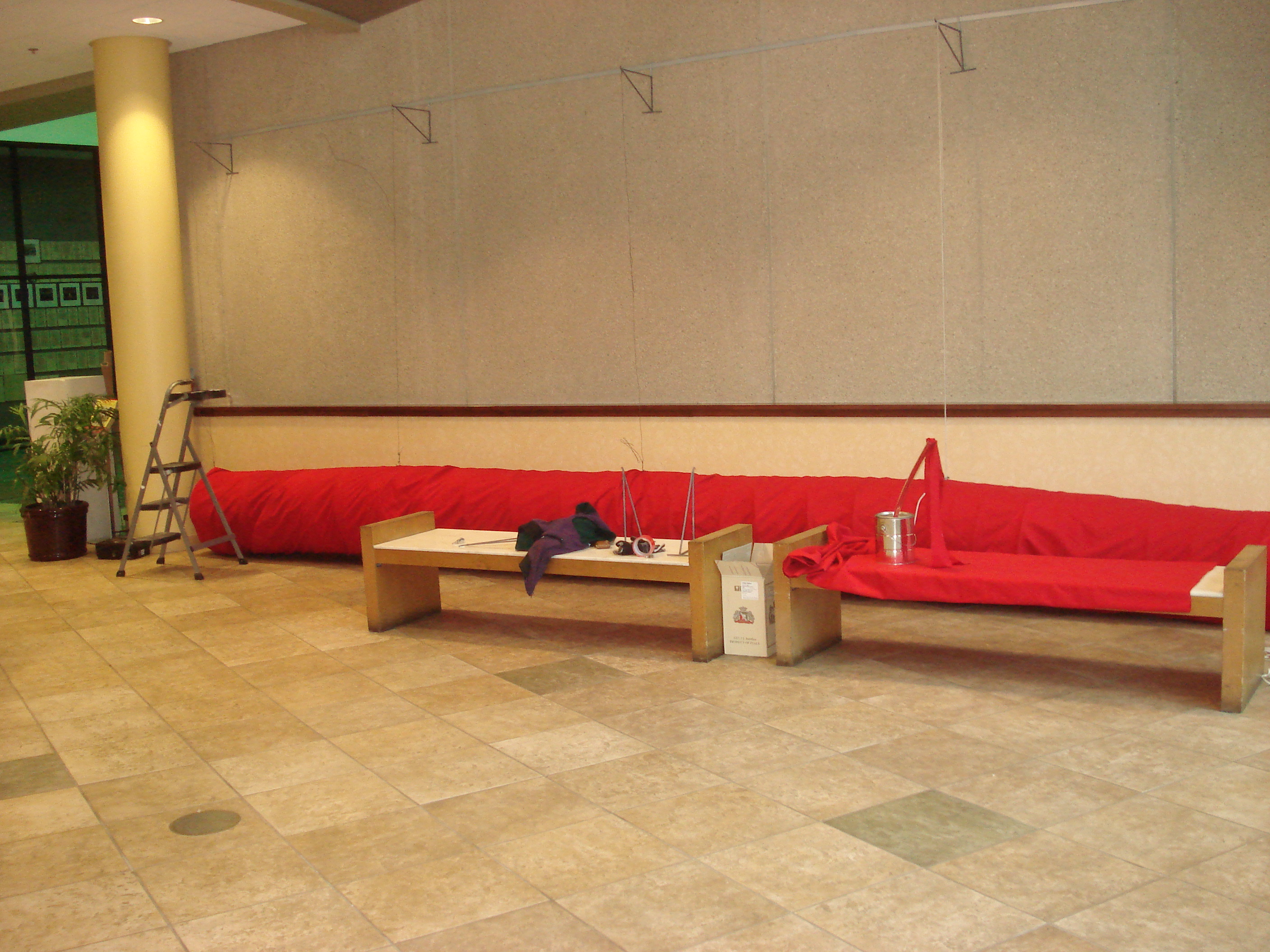 The sculpture employs over 600 feet of stainless steel wire which comes rolled in a coil. This wire can be pulled apart just the way a slinky toy can be extended to form a tube of sorts. Then 26 feet of 1/2 inch stainless steel tubing is inserted and attached to form a spine and stabilize the wire tube. This skeleton is then suspended about a foot off the ground and wrapped with about 25 yards of red cotton fabric that is 9 feet wide. Voila! RED is born.