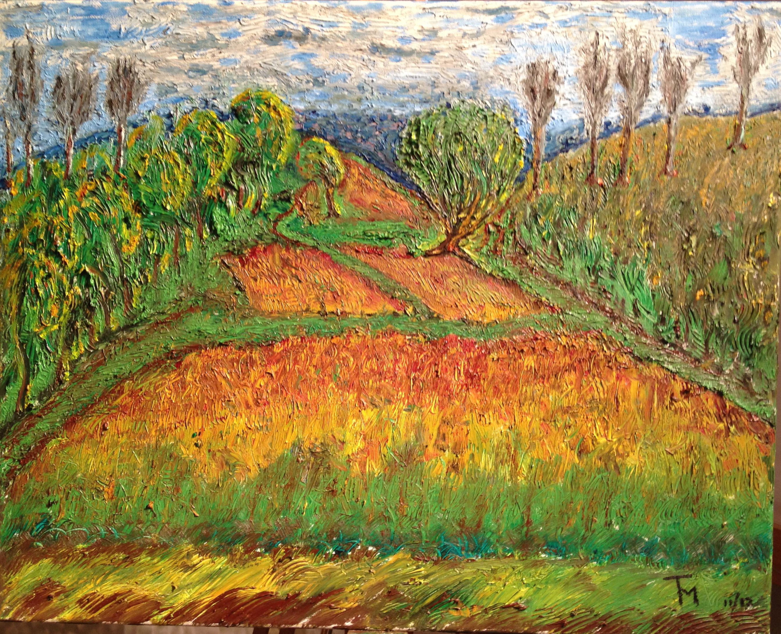 The day I painted this picture was not particularly hospitable. Although sunny, it was windy and got progressively colder. Near the end of this plein air session, a cold, light rain began to fall. I was freezing and getting numb all over, especially my palette hand which also held my reserve brushes. My fingers cramped from the cold.